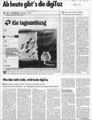 Aber nicht alles ist Politik. Zwischen Fotos von Demos und Randnotizen zu Verbänden kommen zunehmend mehr Artikel, die sich mit Digitalisierung beschäftigen (auch hier half der Zivildienst und der Zugang zu diversen Zeitschriften, der damit verbunden war). Erörterungen über Unzulänglichkeit der Metapher der Datenautobahn, Hacker-Porträts und ein Interview mit Joseph Weizenbaum sind nur einige der Fundstücke. Und passend zur vor wenigen Tagen erschienenen letzten Papierausgabe der wochentäglichen taz habe ich auch die damalige Ankündigung der ersten „digiTaz“ aufgehoben – samt Erläuterung, was dieses Internet eigentlich ist, und der eingängigen Adresse http://www.prz.tu-berlin.de/taz zum Aufruf der digitalen Zeitung. Parallel dazu wird in anderen Zeitungsausrissen darüber spekuliert, ob mit dem baldigen Ende der Zeitung auf Papier und dem papierlosen Büro zu rechnen sei. Hat etwas länger gedauert …