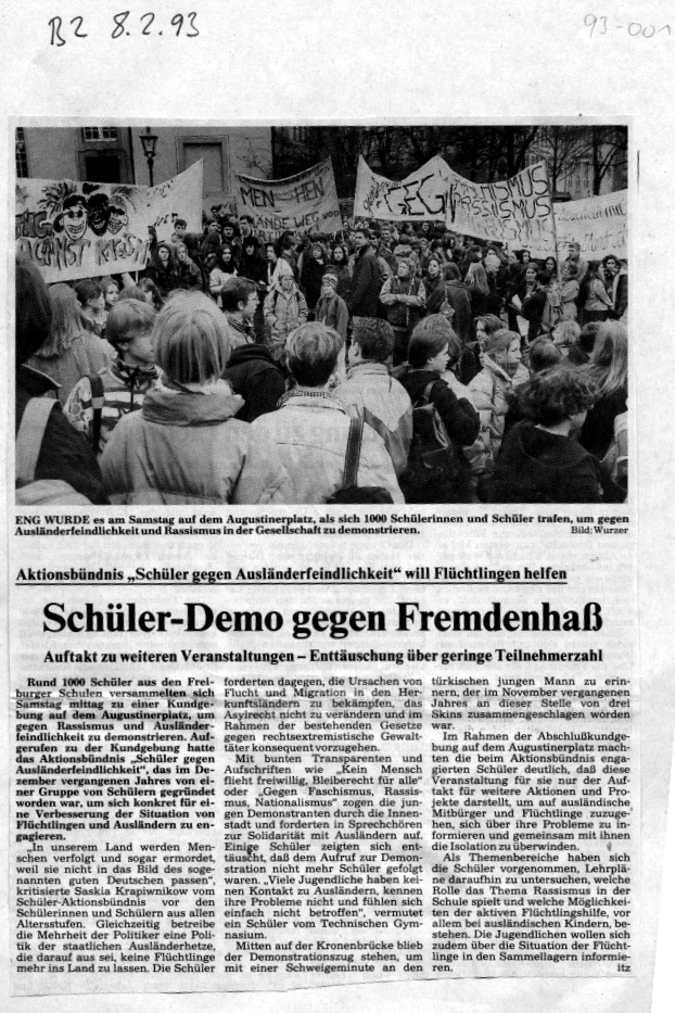 1993, gleich der erste aufgehobene Artikel, ist aus der Badischen Zeitung und berichtet über eine „Schüler-Demo gegen Fremdenhaß“ mit gut 1000 Teilnehmenden („Enttäuschung über die geringe Teilnehmerzahl“). Interessant in dem Zusammenhang auch ein Flugblatt des Freiburger Kreisverbands der Grünen, das ich als Konzeptpapier zum Aufkleben der Presseschnippsel verwendet hatte. Das dürfte ebenfalls aus dem Jahr 1993 oder 1994 stammen und trägt den Titel: „Der Feind steht rechts!“ (ein Zitat des Reichskanzlers Wirth, 1922). Sammelunterkünfte für Asylsuchende ebenso wie die politische Annäherung der CDU an die damaligen „Republikaner“ werden thematisiert. Klingt leider alles brandaktuell.