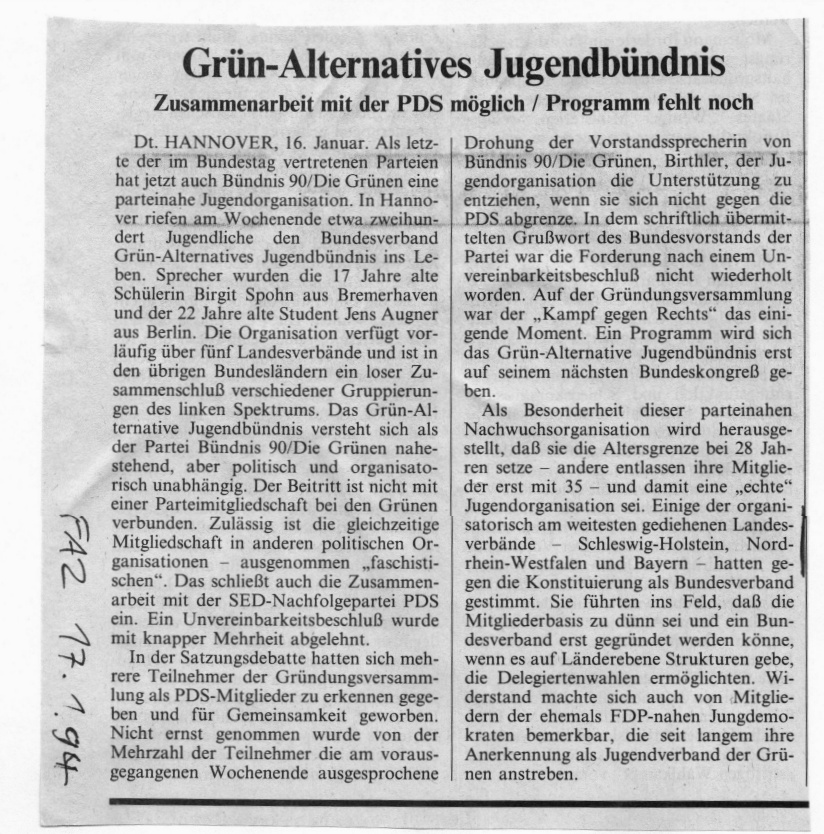Jugendpolitische Aktivitäten im engeren Sinne spielen natürlich eine große Rolle. So geht es um die damals anstehende Abschaffung des 13. Schuljahrs (Baden-Württemberg führt es dieses Jahr wieder ein) – die „Regionale SchülerInnen-Versammlung“ mit Alexander Bonde (dann Vorsitzender des Landesschülerbeirats, später MdB und dann Landwirtschaftsminister in Baden-Württemberg, heute Generalsekretär der Deutschen Bundesstiftung Umwelt) organisiert dazu einige Aktionen. Und Franziska Brantner (heute MdB und grüne Bundesvorsitzende) gibt ein erstes Interview als 15-jährige, in der sie erklärt, was die Jugendkonferenz der Stadt Freiburg bringen soll, und warum es wichtig ist, Jugendlichen selbst Gehör zu schenken. Die Gründung des Grün-Alternativen Jugendbündnisses nimmt Raum ein (die FAZ guckt genau, ob es eine Abgrenzung zur damaligen „PDS“ gibt, oder ob hier linksradikale Umtriebe zu befürchten sind), und ebenso finden sich Ausrisse zu Querelen bei den Jusos, einem Empfang der Landesregierung unter Ministerpräsident Teufel für Jugendorganisationen und dergleichen mehr.