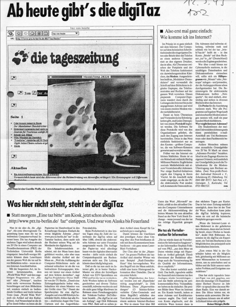 Aber nicht alles ist Politik. Zwischen Fotos von Demos und Randnotizen zu Verbänden kommen zunehmend mehr Artikel, die sich mit Digitalisierung beschäftigen (auch hier half der Zivildienst und der Zugang zu diversen Zeitschriften, der damit verbunden war). Erörterungen über Unzulänglichkeit der Metapher der Datenautobahn, Hacker-Porträts und ein Interview mit Joseph Weizenbaum sind nur einige der Fundstücke. Und passend zur vor wenigen Tagen erschienenen letzten Papierausgabe der wochentäglichen taz habe ich auch die damalige Ankündigung der ersten „digiTaz“ aufgehoben – samt Erläuterung, was dieses Internet eigentlich ist, und der eingängigen Adresse http://www.prz.tu-berlin.de/taz zum Aufruf der digitalen Zeitung. Parallel dazu wird in anderen Zeitungsausrissen darüber spekuliert, ob mit dem baldigen Ende der Zeitung auf Papier und dem papierlosen Büro zu rechnen sei. Hat etwas länger gedauert …