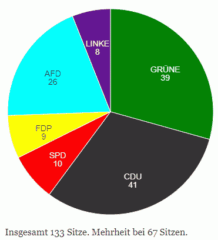 Wenn die Wahl am kommenden Sonntag tatsächlich so ausgehen würde, kämen wir damit auf einen Landtag mit „nur“ 133 Sitzen (aktuell: 154), davon 39 Grüne und 41 CDU.
